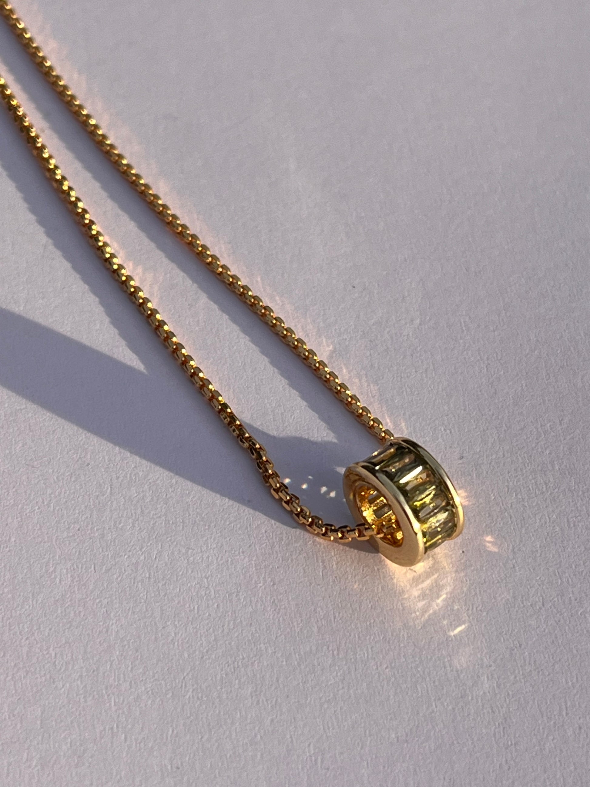 Gold filled tube peridot charm on a 17” gold filled chain. Light green in color, makes a perfect stacking piece.