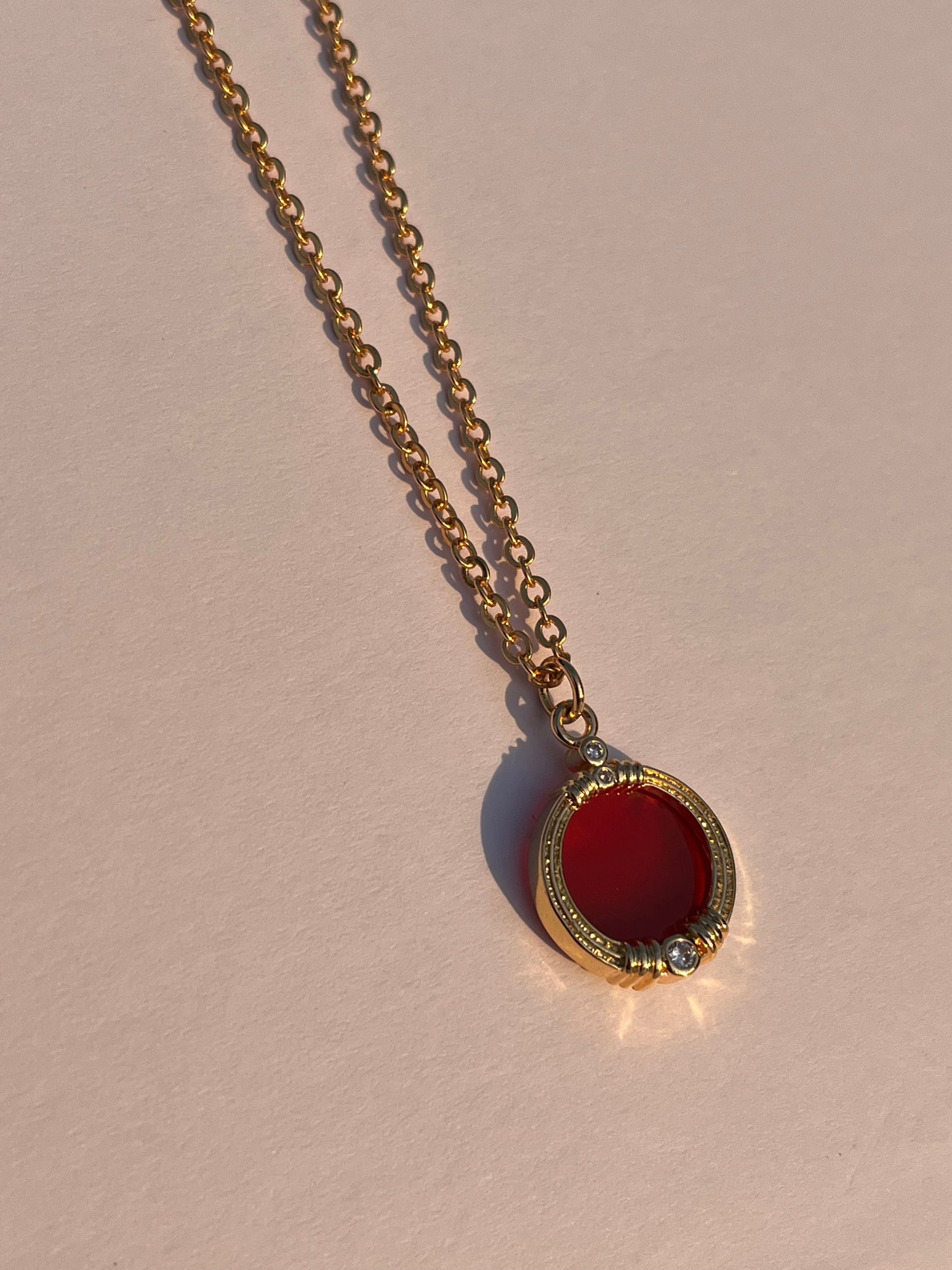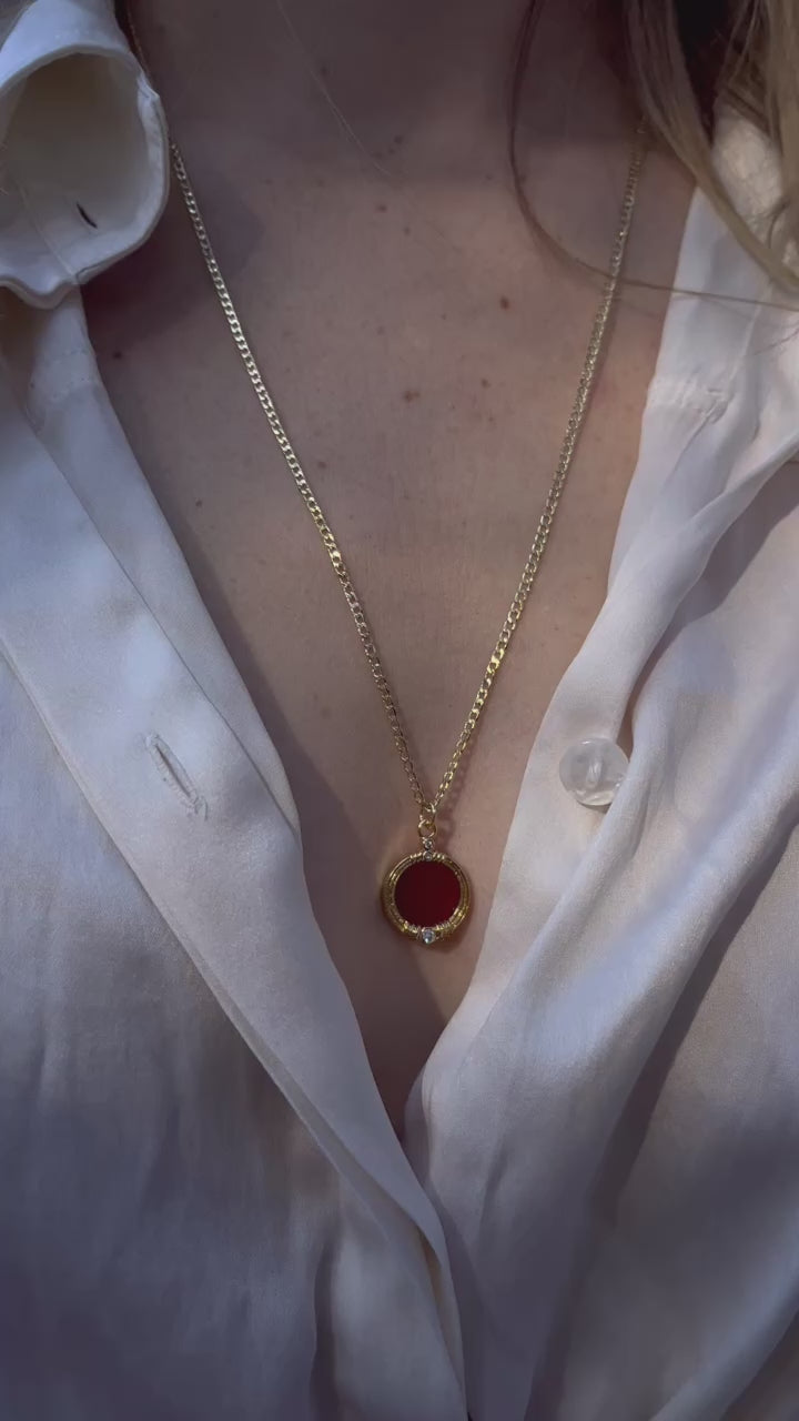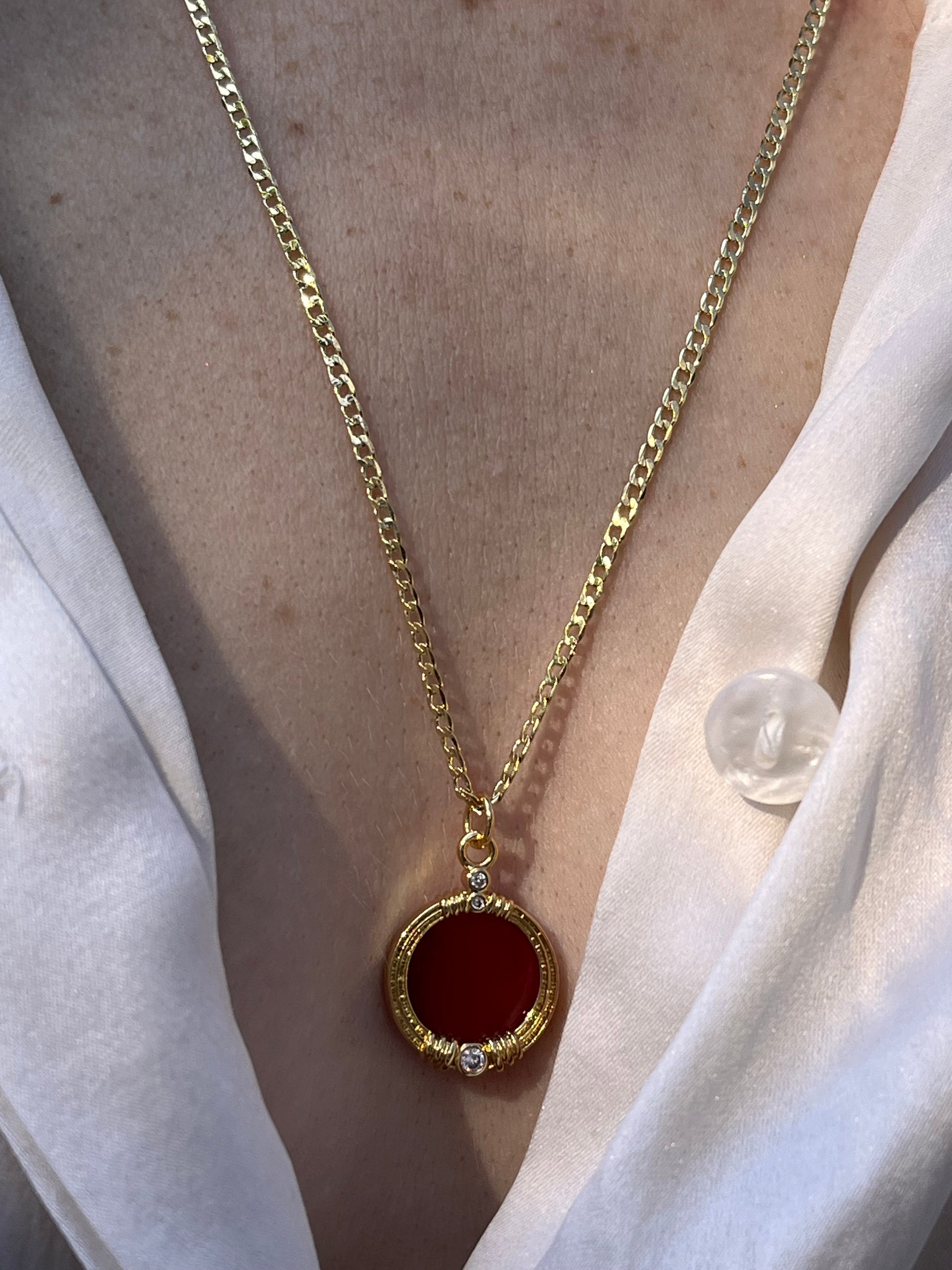 This striking red carnelian disc pendant necklace, radiates warmth and vitality with its vibrant hue. Suspended on a 24-inch delicate cuban chain, this piece not only enhances your style but also harnesses the healing properties of carnelian. Known for its ability to boost energy, creativity, and motivation, carnelian is believed to stimulate courage and passion while dispelling negative emotions. This piece is for inspiring confidence and vitality in your daily life.