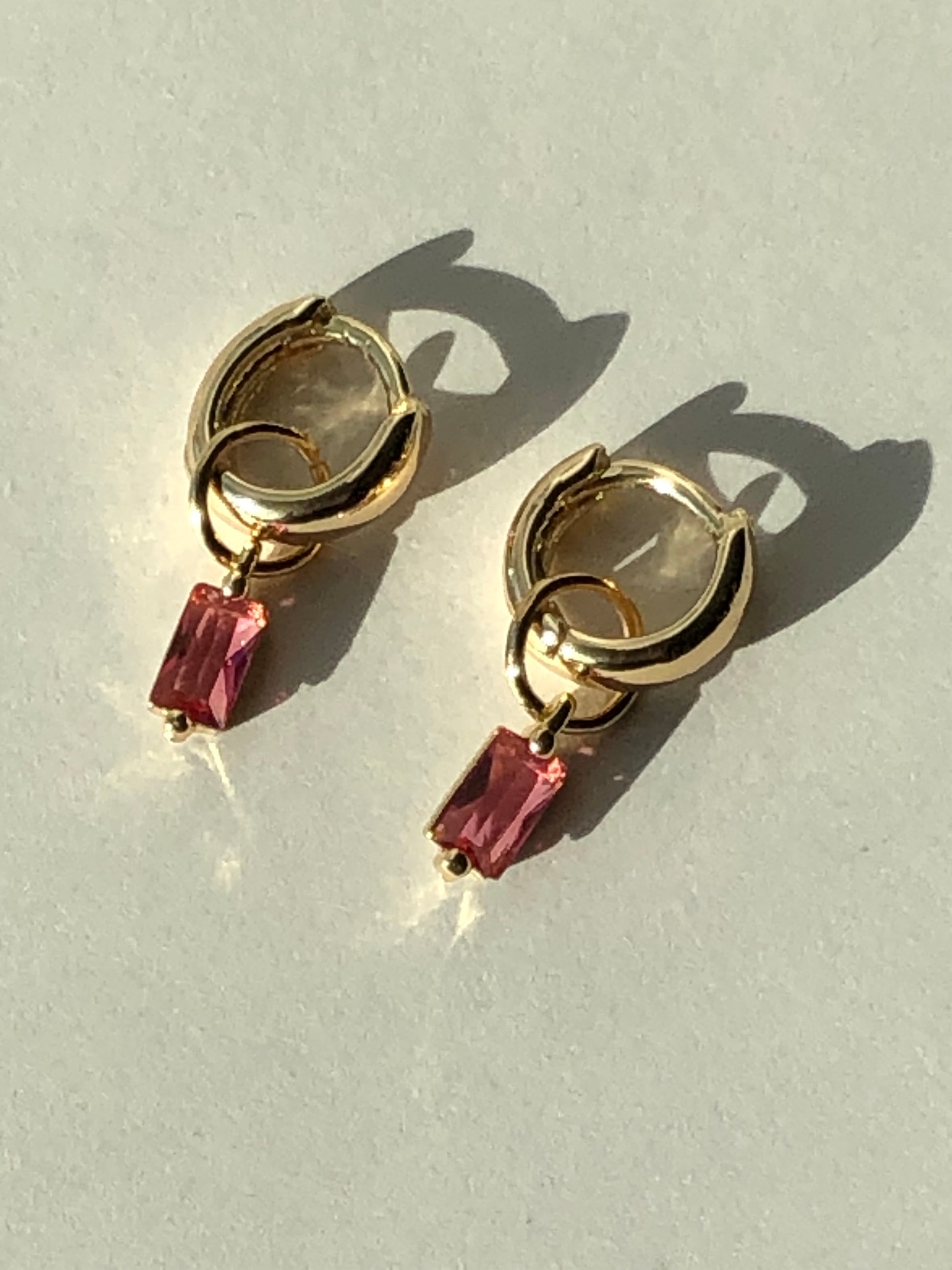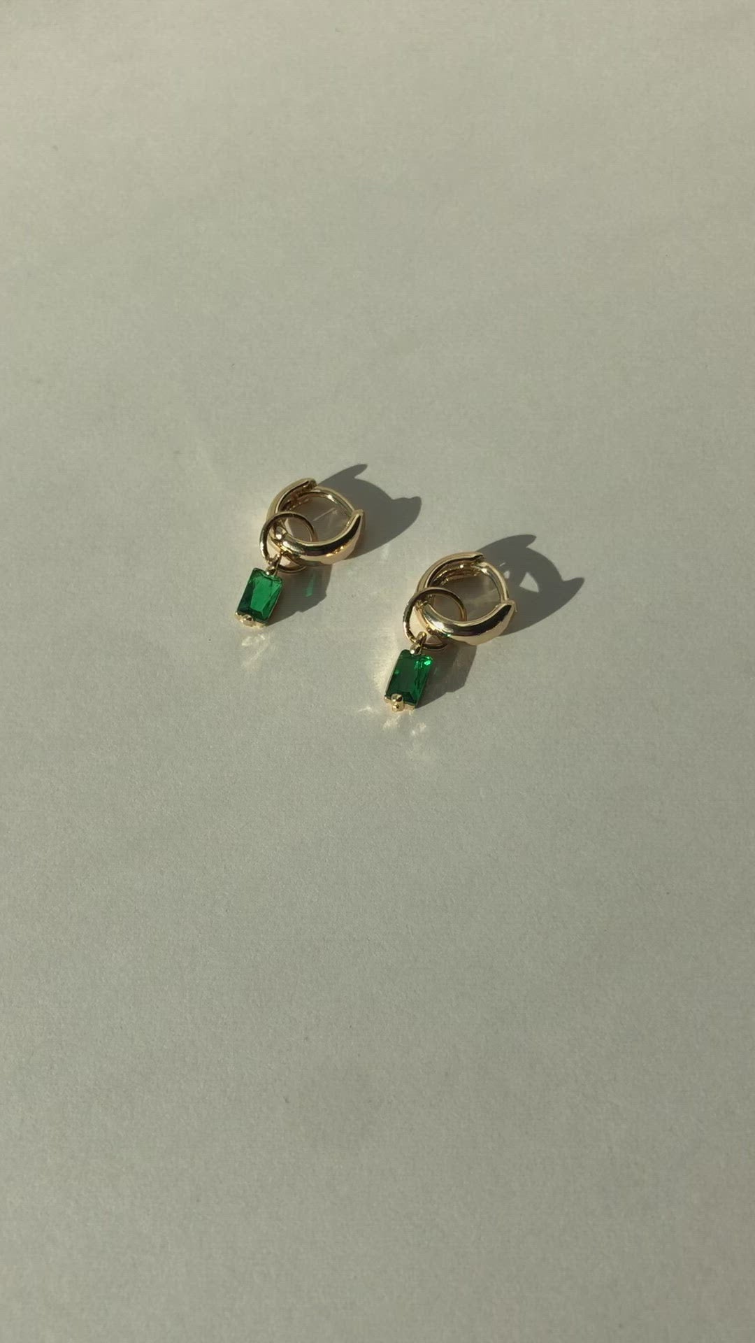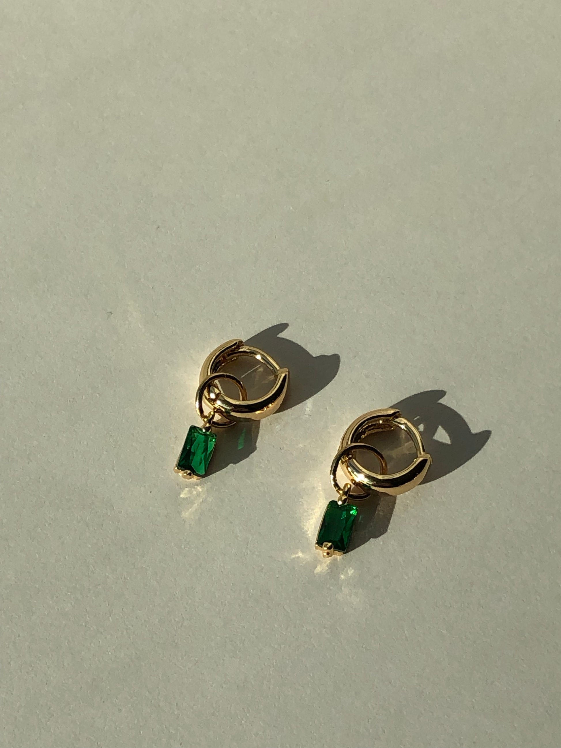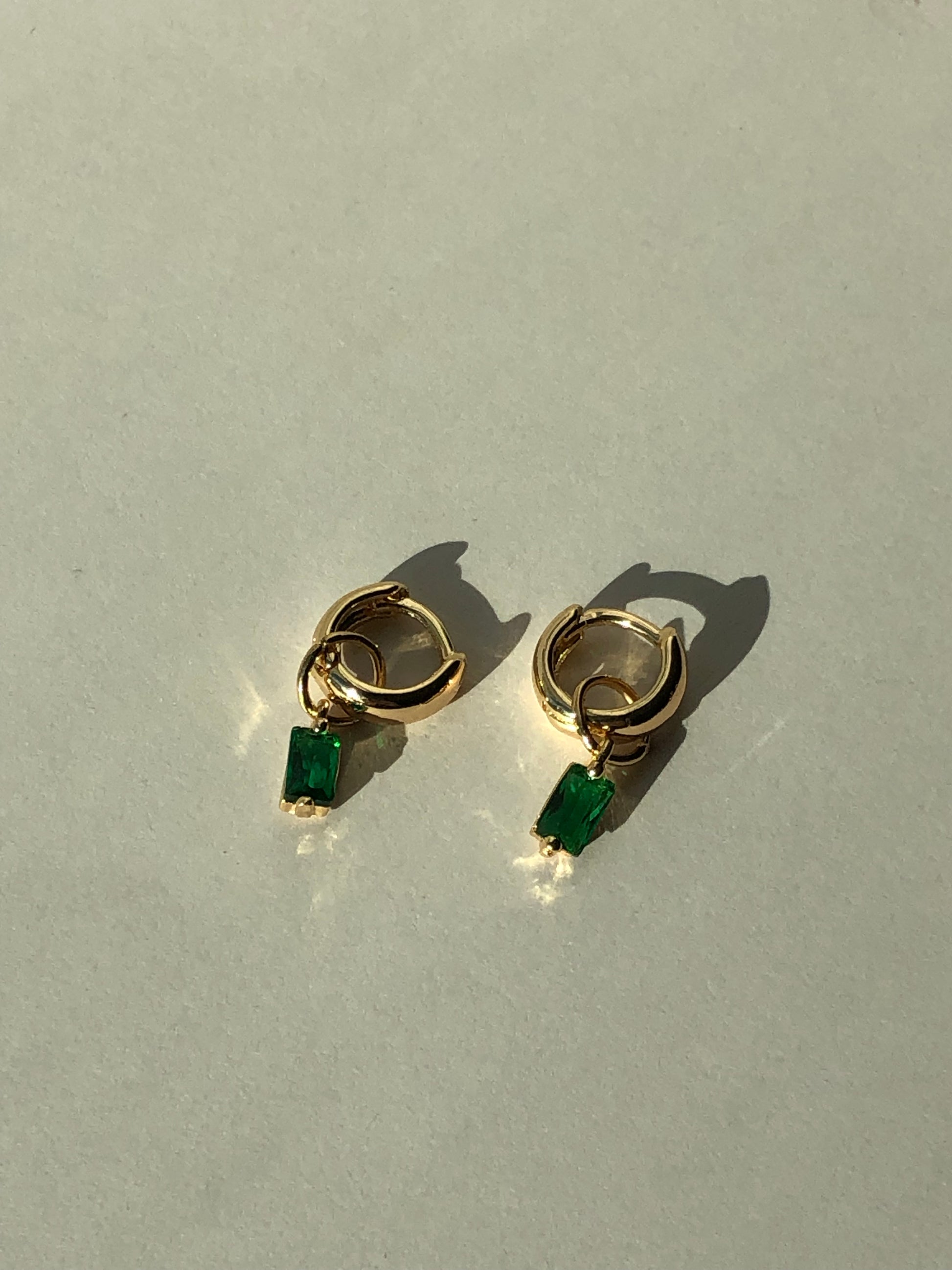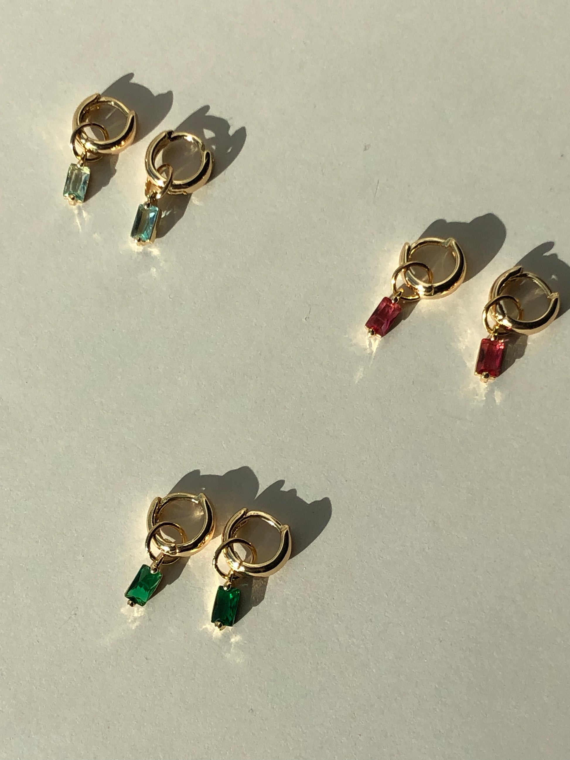 24k gold filled huggies and 18k gold filled dangle pendants. Available in emerald, aquamarine and rose.