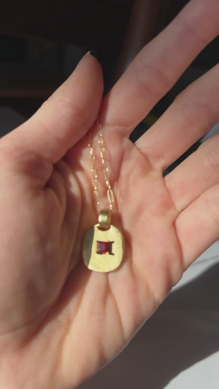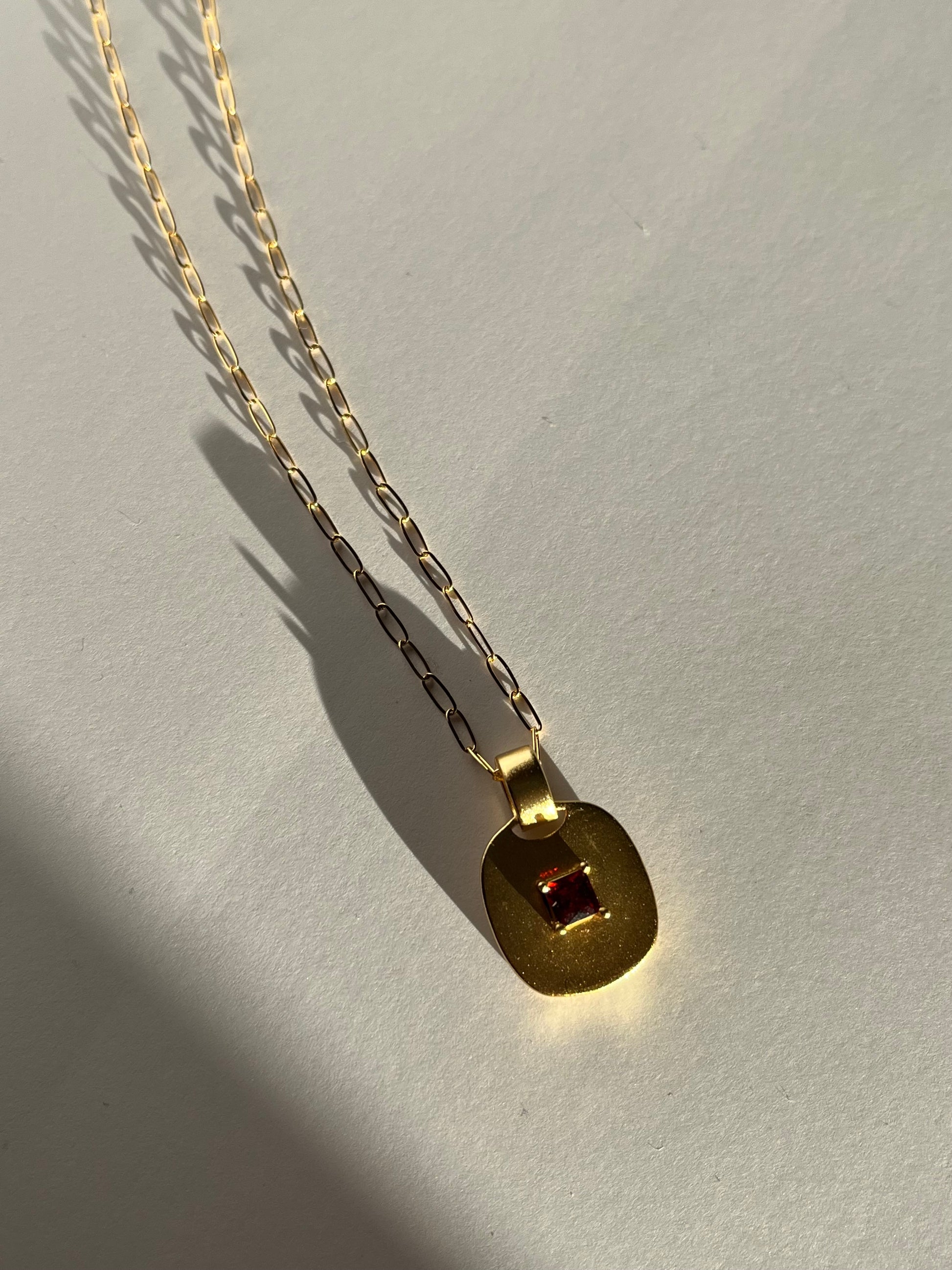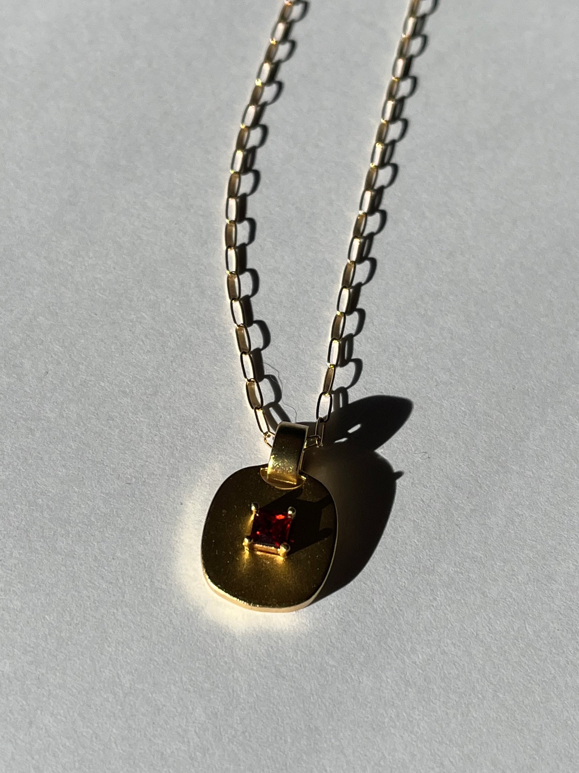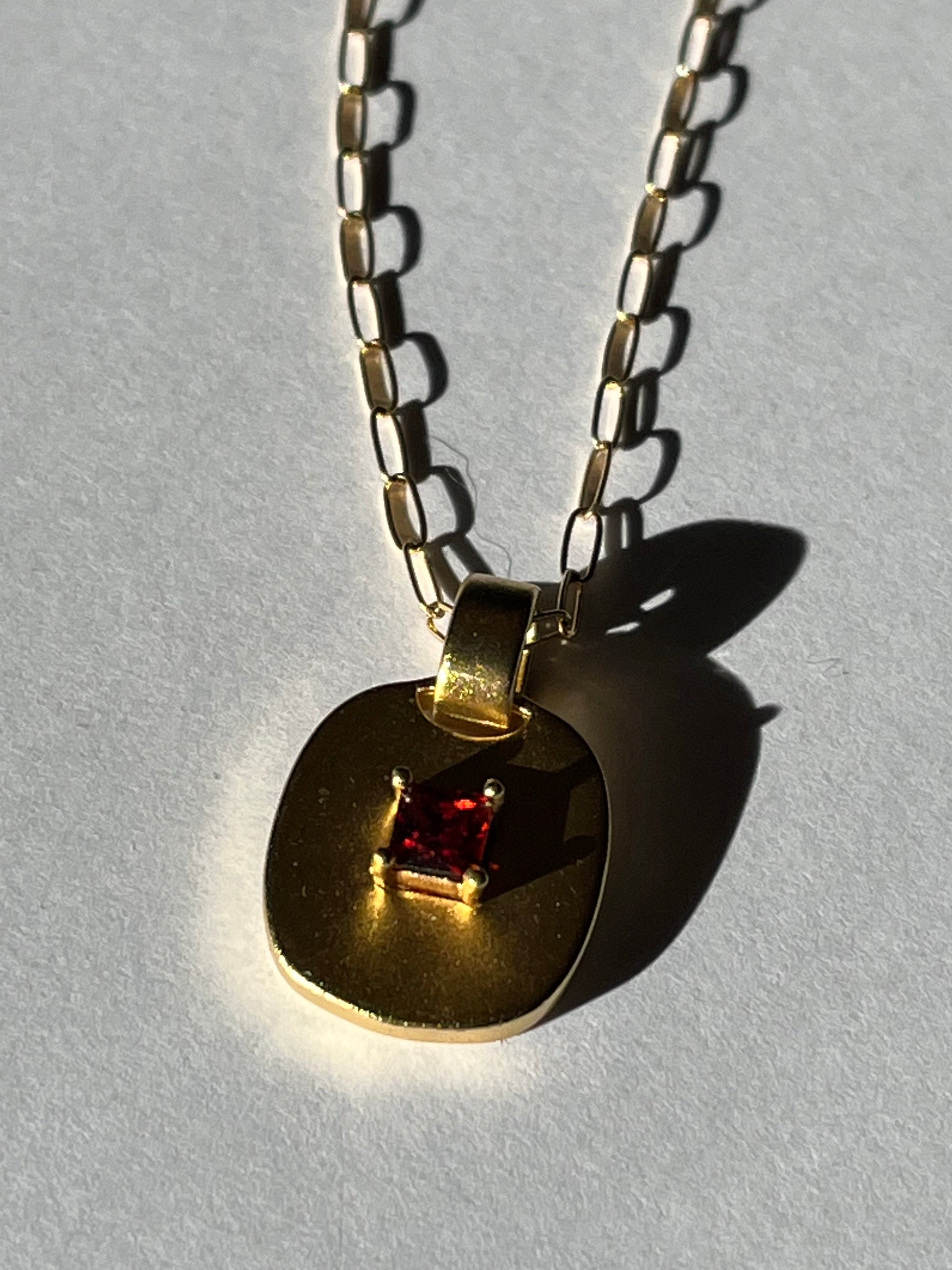 Brushed matte gold pendant with a small square garnet stone in the center.