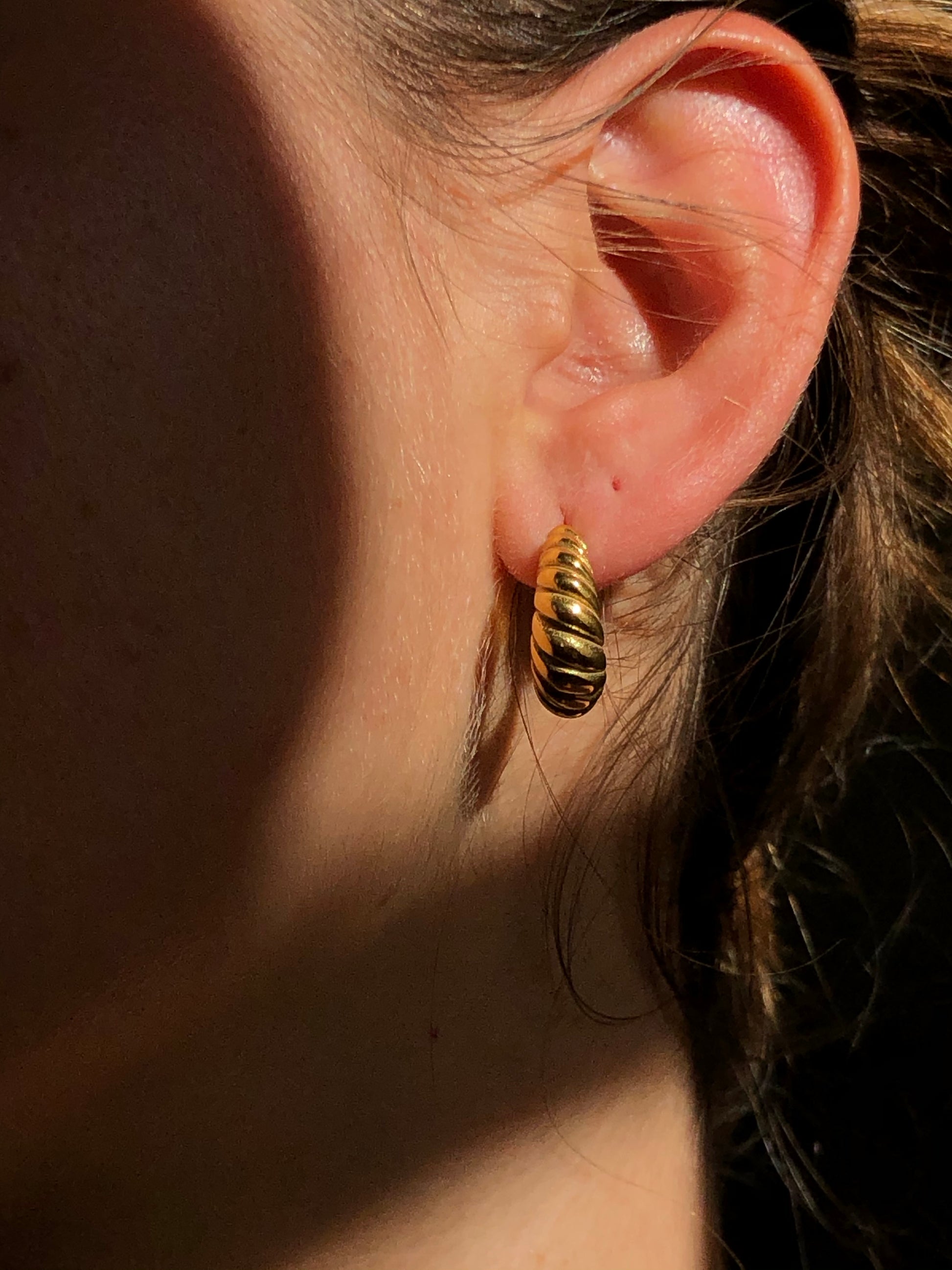 The croissant French twist earrings are simple and light weight. 18 karat gold filled.