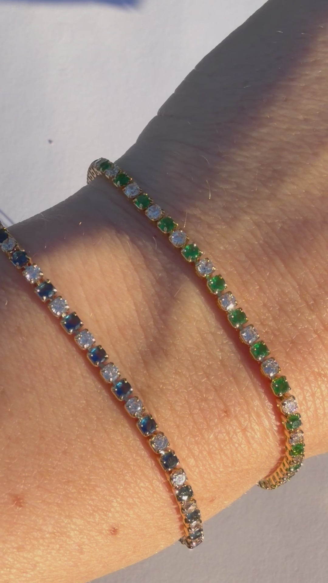 Add a little mini tennis bracelet to your wrist stack. Featuring emerald and sapphire CZs, these elegant bracelets come with a 1" extender for a perfect fit.