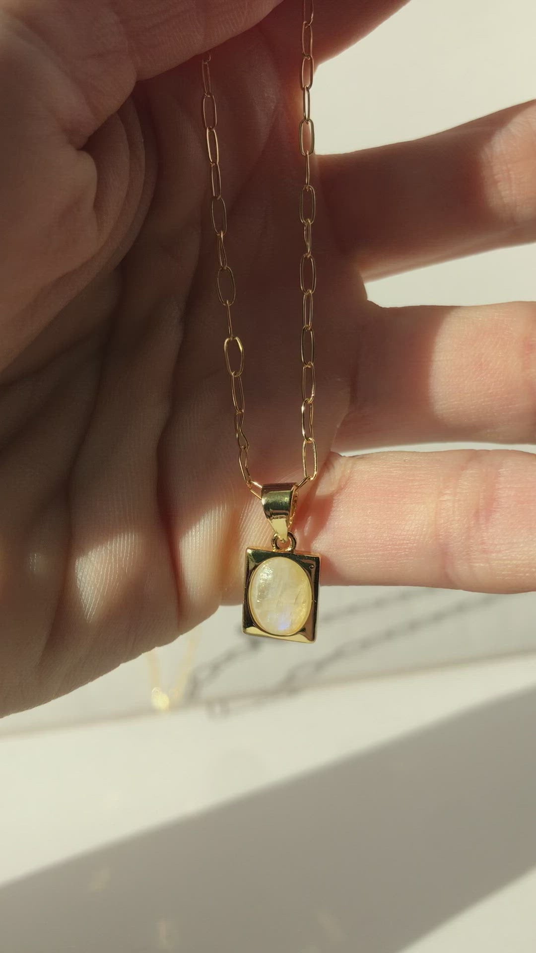 The most precious mini rectangle moonstone necklace pendant on 14k gold filled paperclip chain. This necklace is 16” in length (shorter).