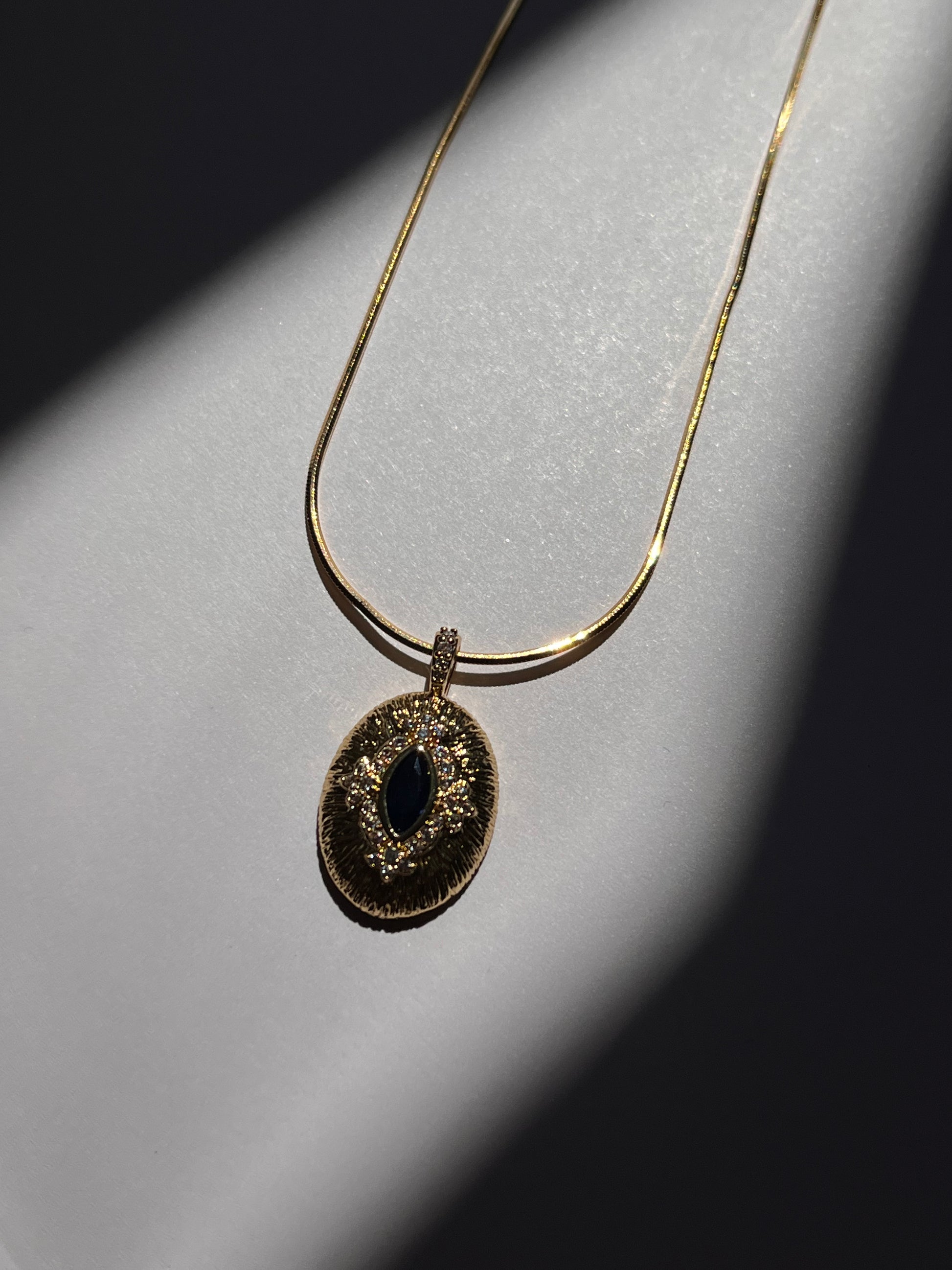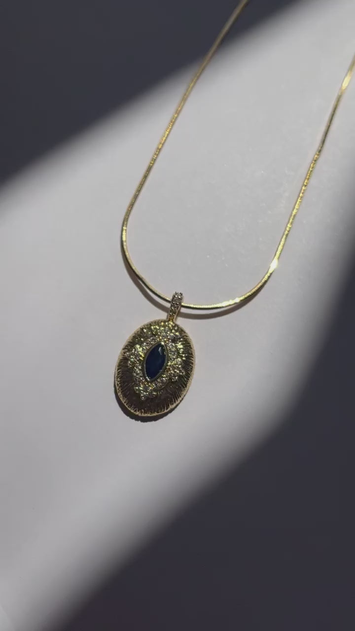 A sapphire cz set into a vintage inspired oval pendant on a slinky & delicate 19.5” snake chain.
