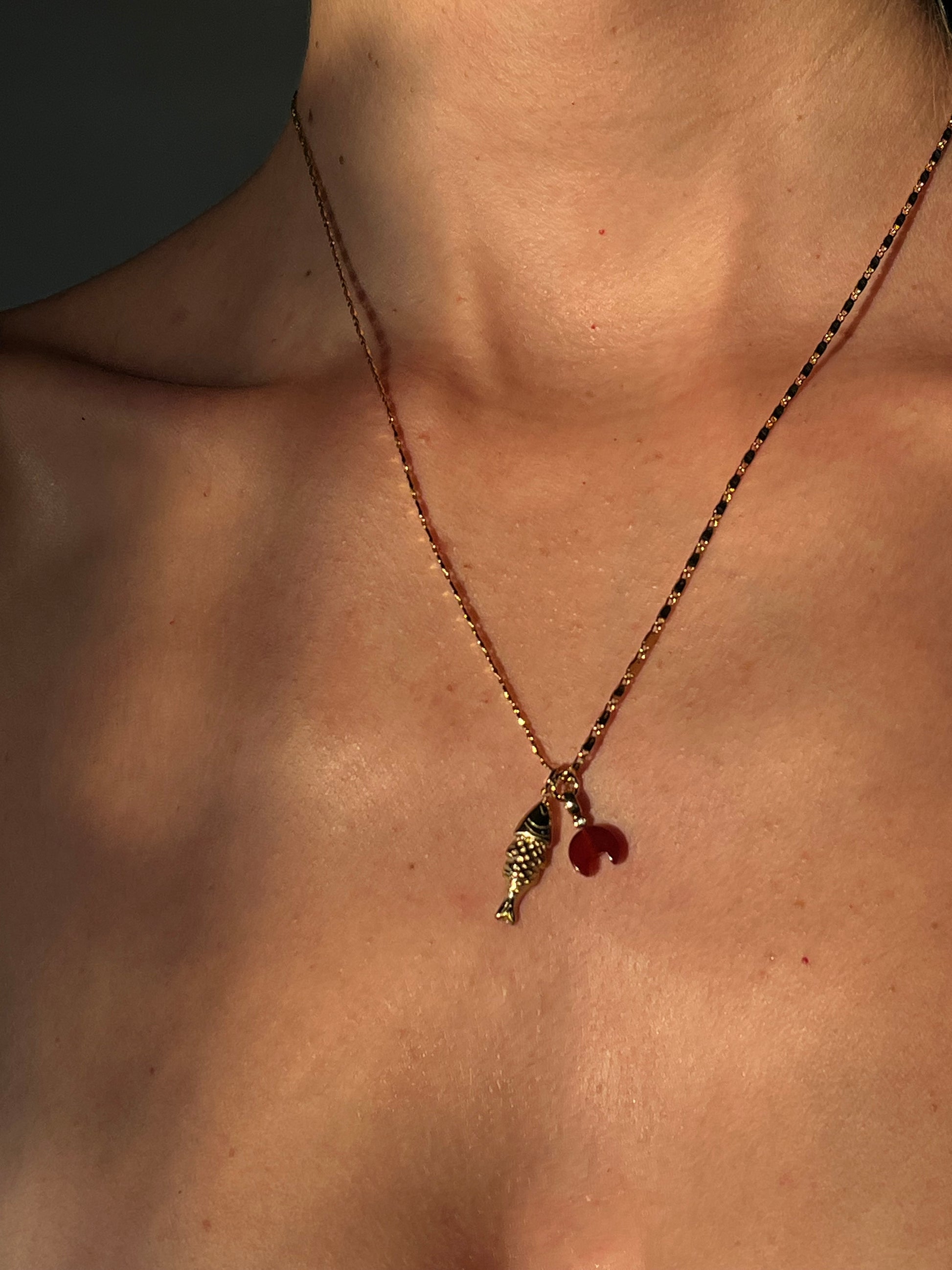 Embrace the symbolism of luck and resilience with our wish fish piece - featuring a mini coy fish charm and sterling silver gold luck disc. The piece embodies the spirit of perseverance and good fortune associated with coy fish. Whether as a personal talisman or a thoughtful gift, this piece serves as a reminder to navigate life's currents with grace and determination.